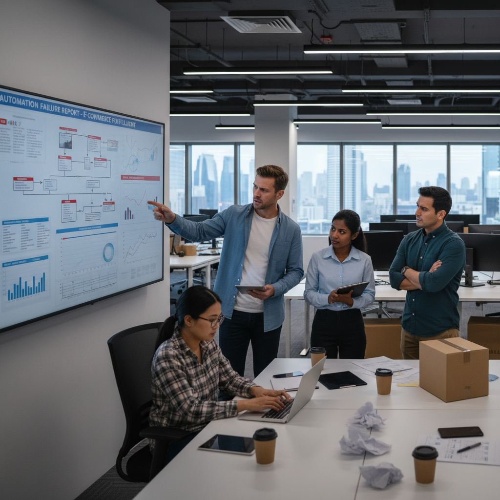 Zespół e-commerce analizujący nieudane wdrożenie automatycznej obsługi klienta