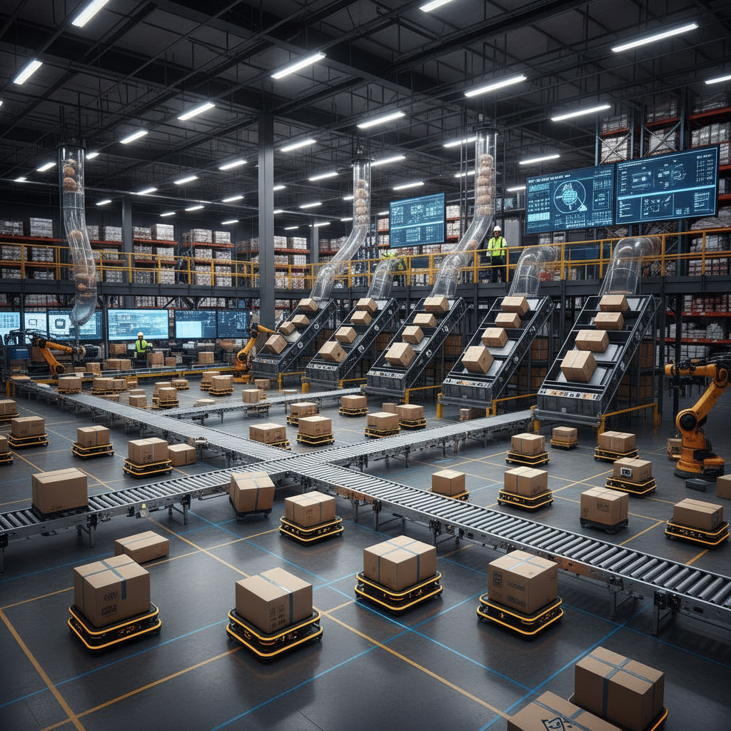Roboty magazynowe sortujące paczki w centrum logistycznym e-commerce, zautomatyzowany fulfillment